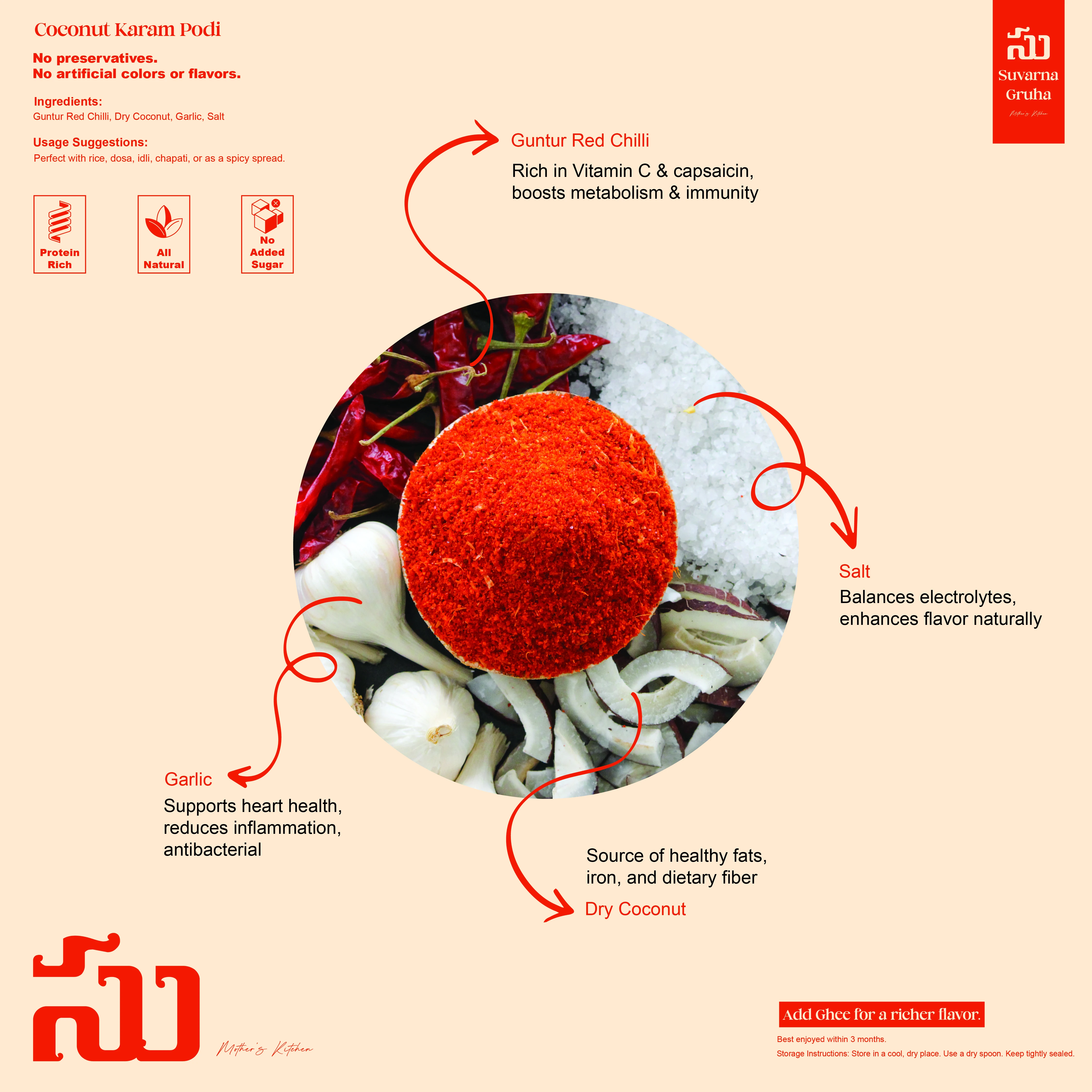 A perfect blend of dry coconut, Guntur red chillies, garlic, a pinch of salt, and select spices — our Coconut Karam Podi is hand-roasted and carefully ground under expert supervision to preserve its rich, authentic Andhra flavor.
