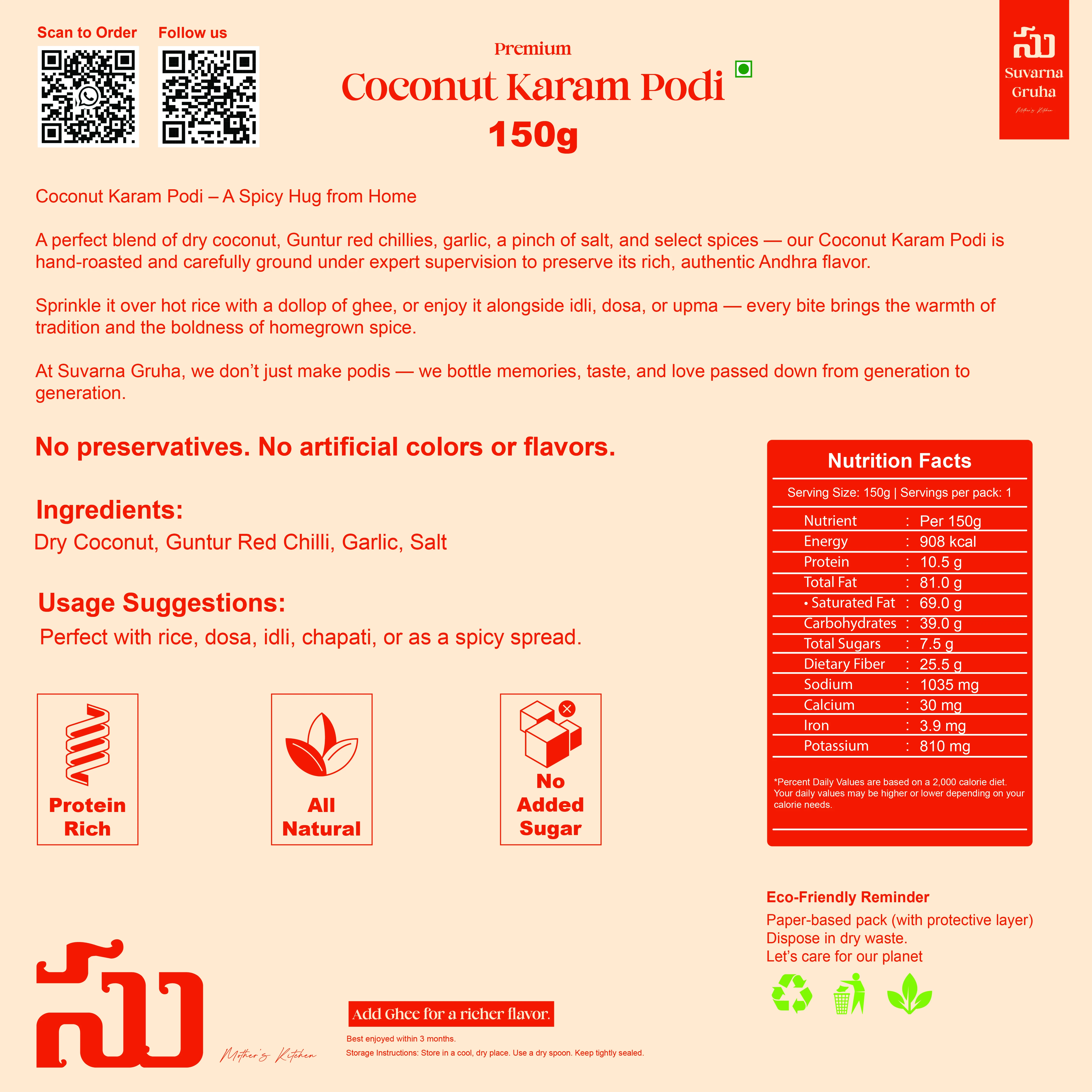 Sprinkle it over hot rice with a dollop of ghee, or enjoy it alongside idli, dosa, or upma — every bite brings the warmth of tradition and the boldness of homegrown spice.